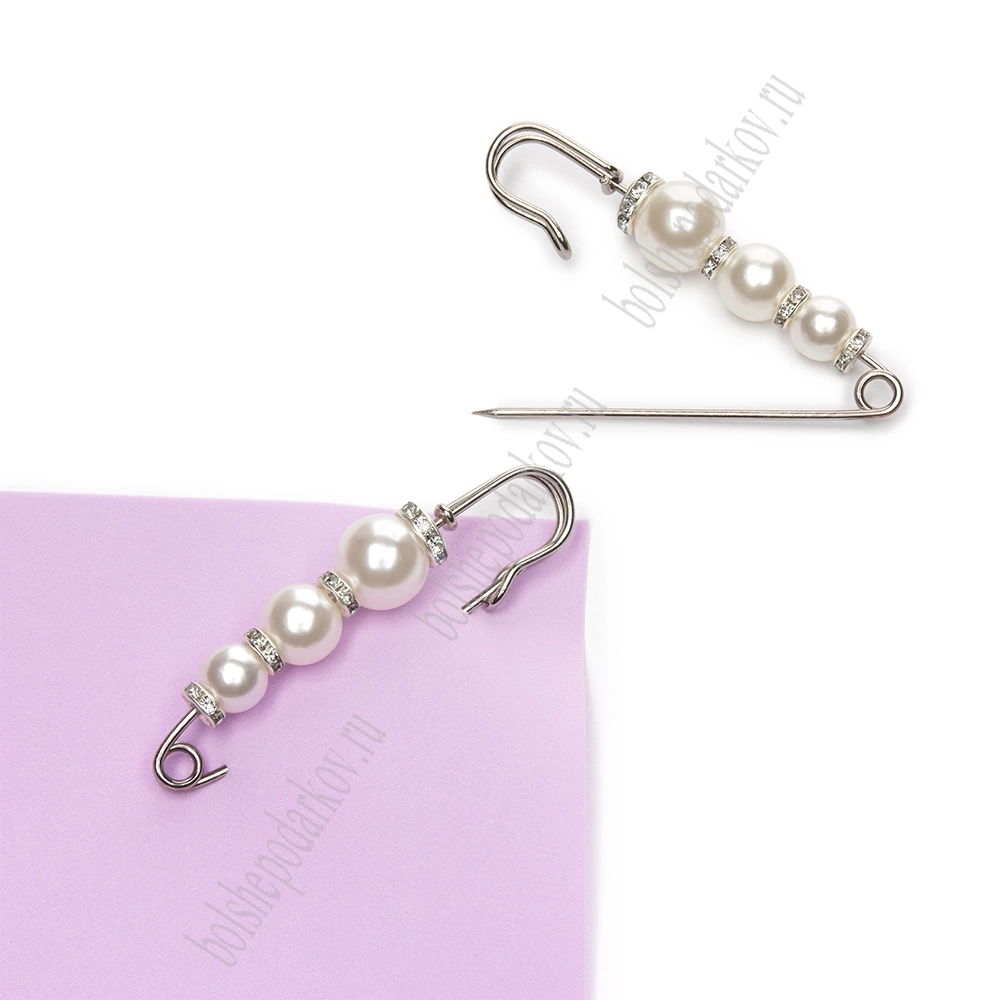 Булавка с 3 бусинами и стразами 7 см (2 шт) SF-1251, белый/серебро