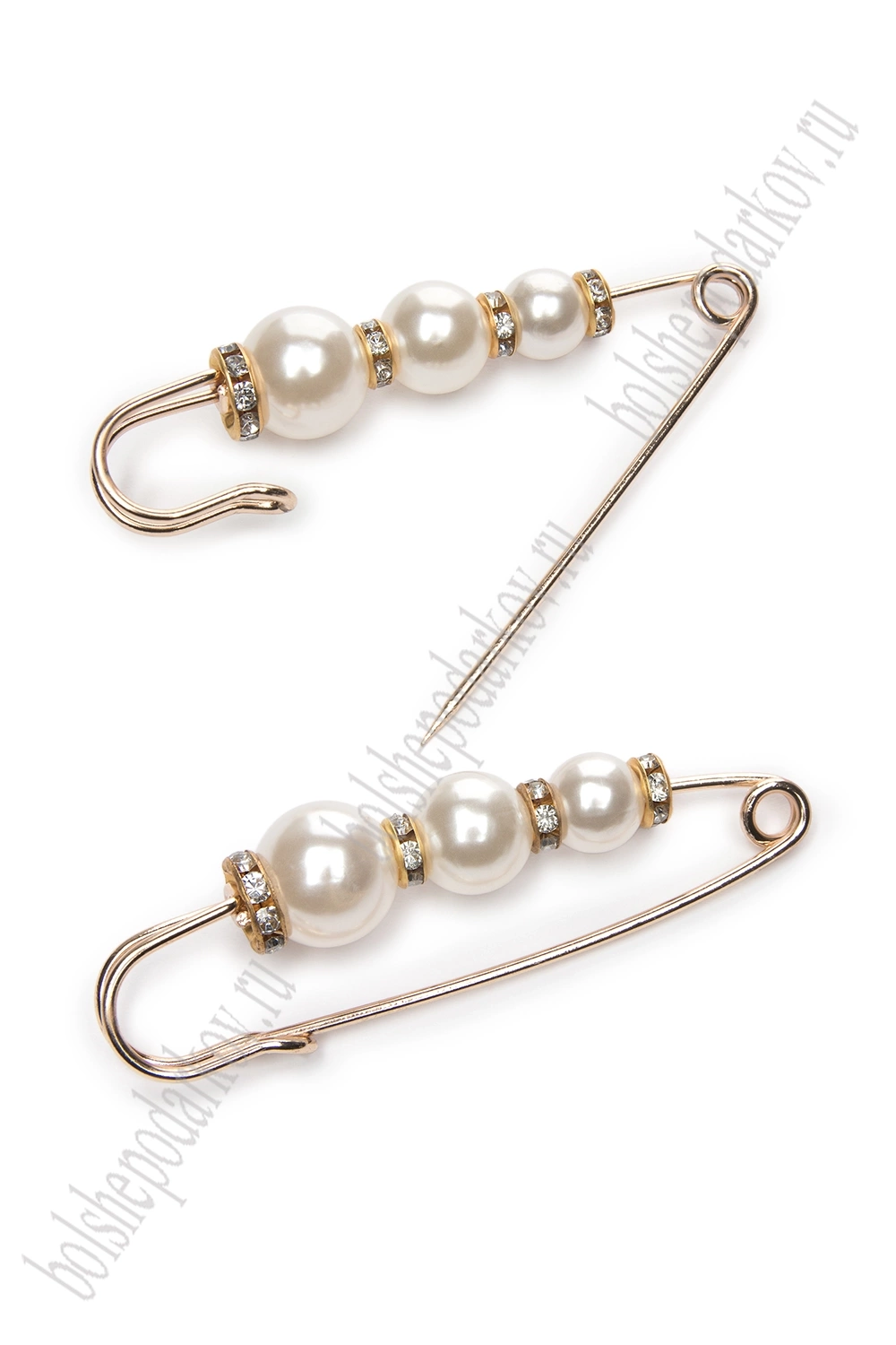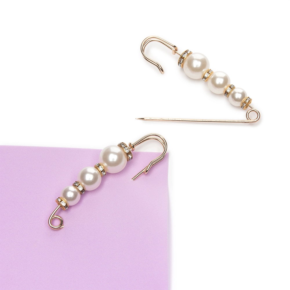 Булавка с 3 бусинами и стразами (2 шт) SF-1251, белый/золото