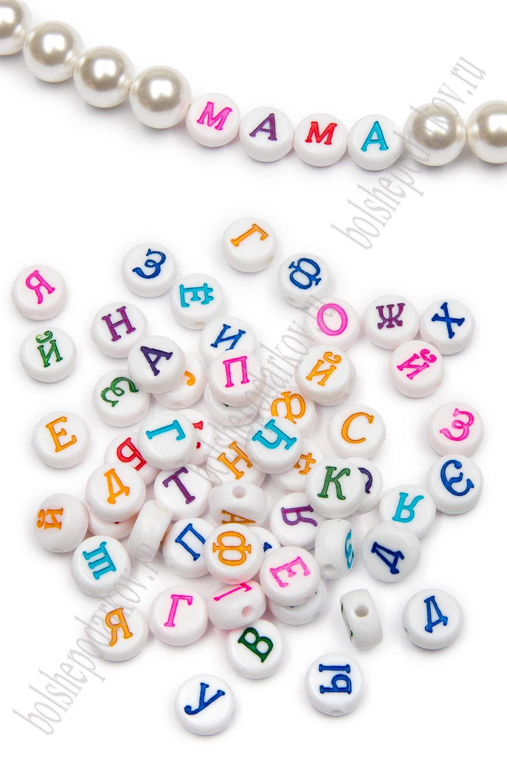 Бусины круглые "Буквы русские" 7 мм (50 гр) SF-7263, белый/мик