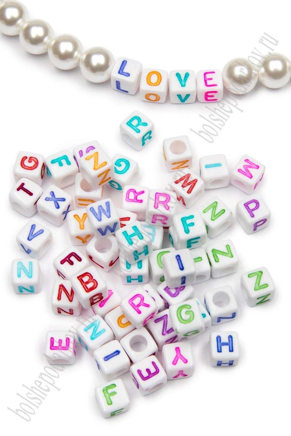 Бусины квадратные "Буквы английские" 6 мм (500 гр) SF-7265, белый/микс