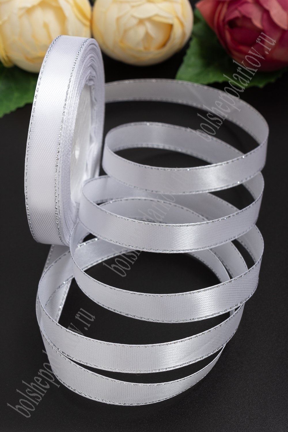 Лента атласная с люрексом 1,2 см*25 ярд (10 бобин) SF-1203, белый/серебро №01
