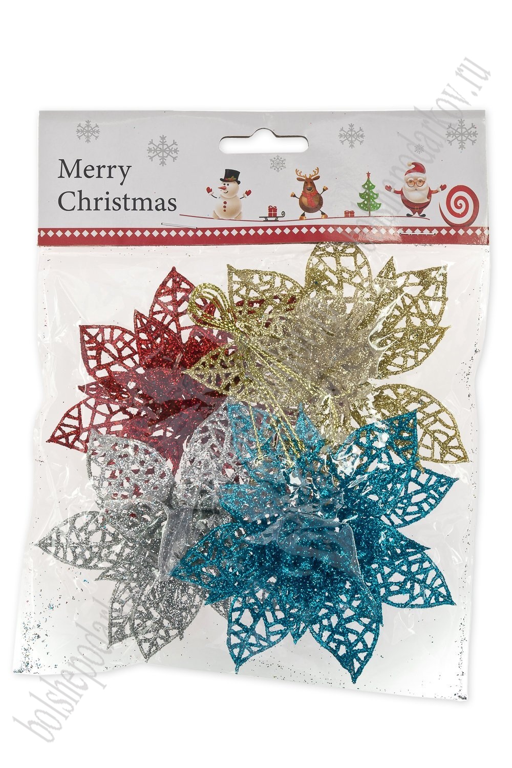 Новогодние украшения с блестками 10 см "Пуансеттия" (4 шт) SF-3510, ассорти №1