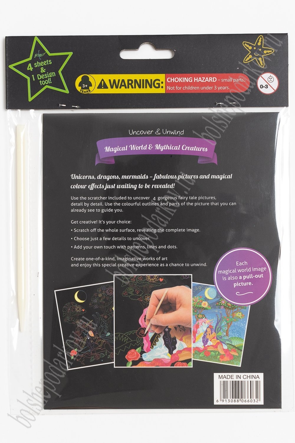 В альбом входит 4 листа: с одной стороны листа скретч-картина, с другой рисунок для раскрашивания; палочка. В одном альбоме 4 разных скретч-картины и рисунка.