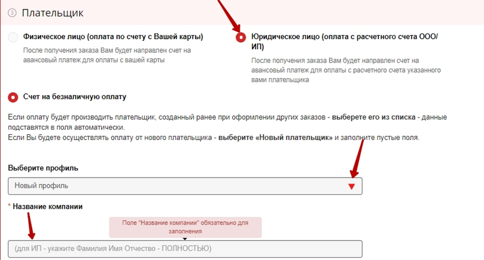 4.3 Плательщик - Выберите способ удобный способ оплаты от физ. лица или юр. лицаа и заполните профиль плательщика (ФИО +