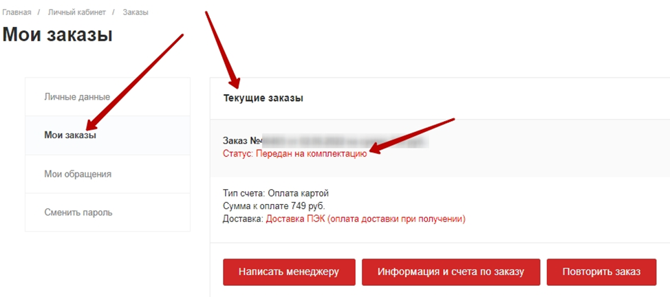 - Также заказ отображается в Личном кабинете в разделе Текущие заказы